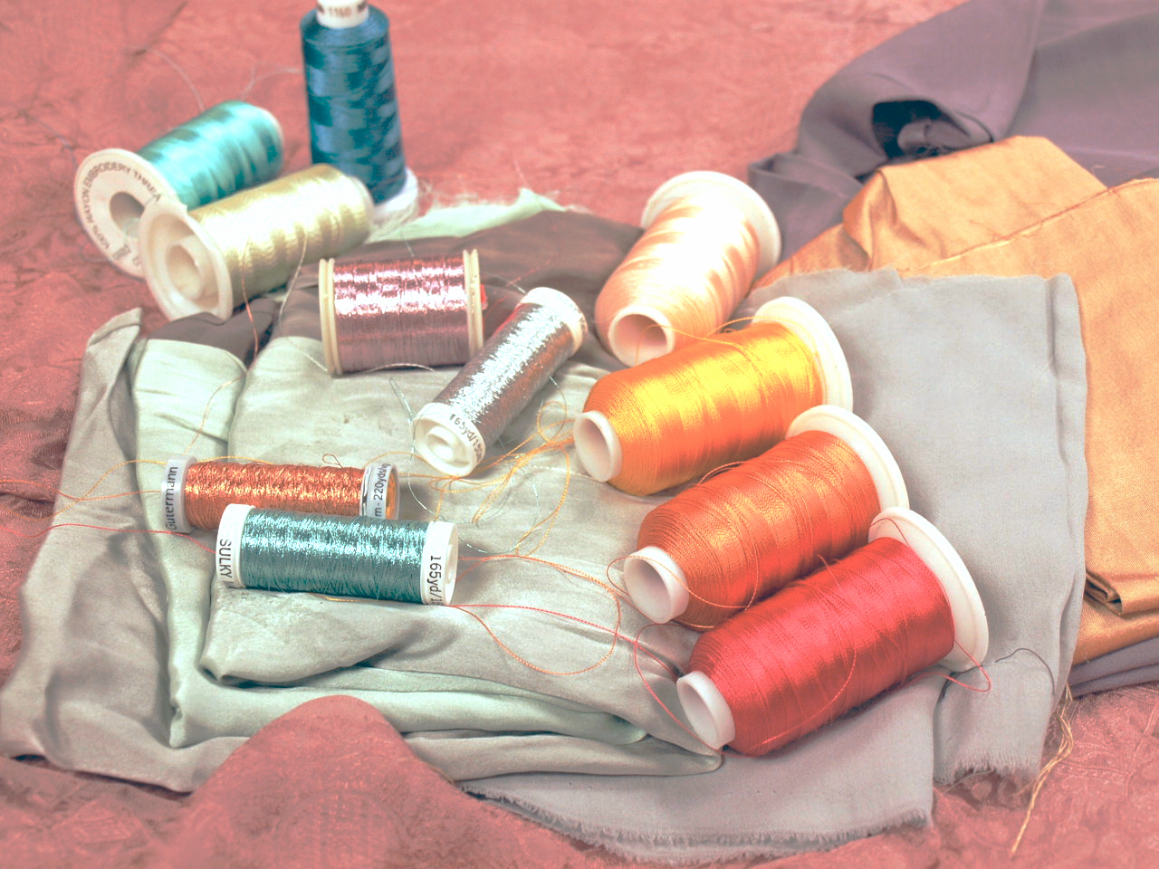 Color stories start to take shape amidst a mess of silky and and metallic threads. Wading through cascades of fine linens and vintage silk fabrics, many combinations of materials are tested before finally deciding on perfect a color way that is both harmonious and unexpected.