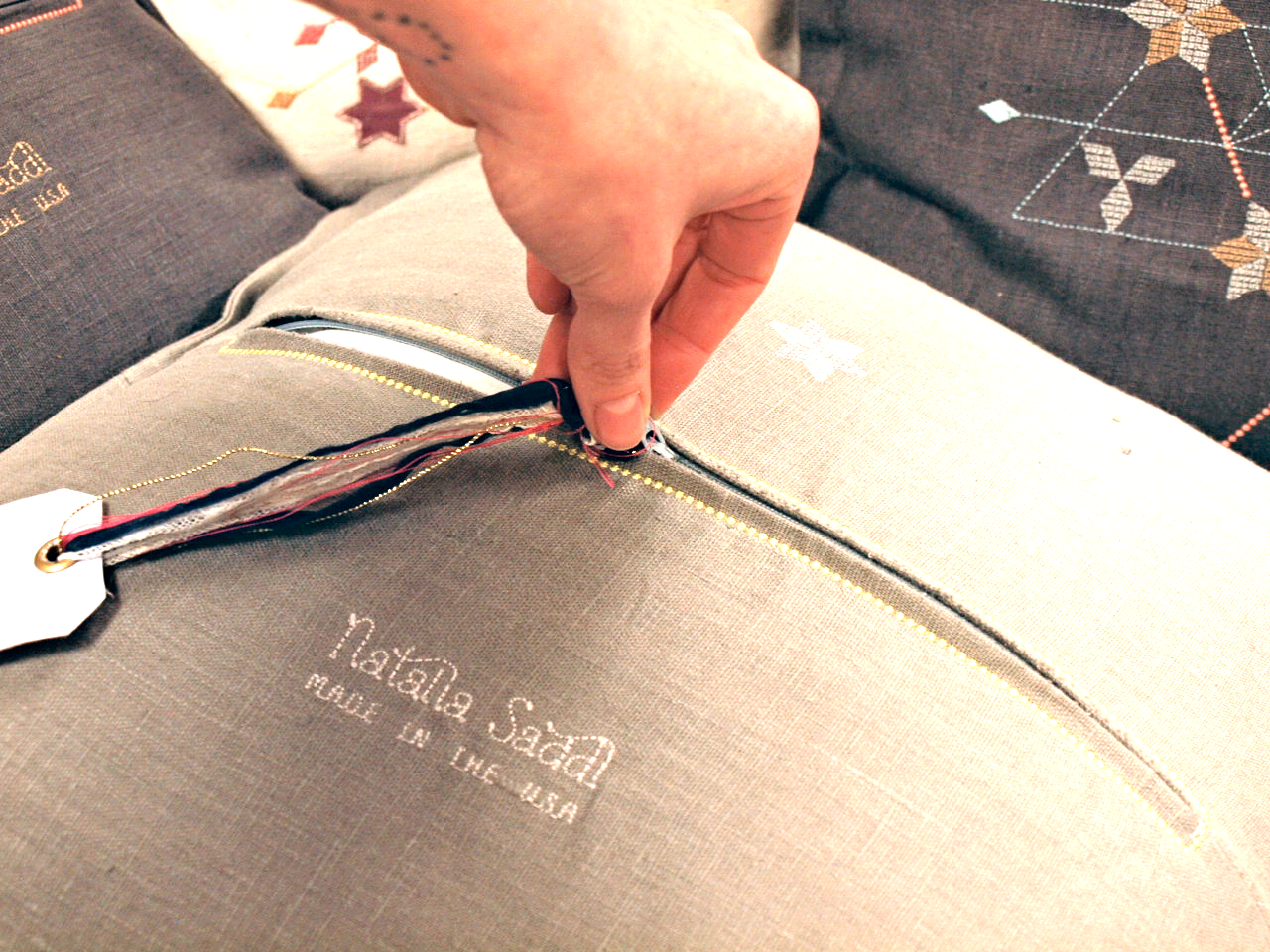 One by one, each cushion cut by hand and stitched up with care in our Philadelphia Studio. A luxury overstuffed 50% goose down, 50% small feather insert completes each piece.