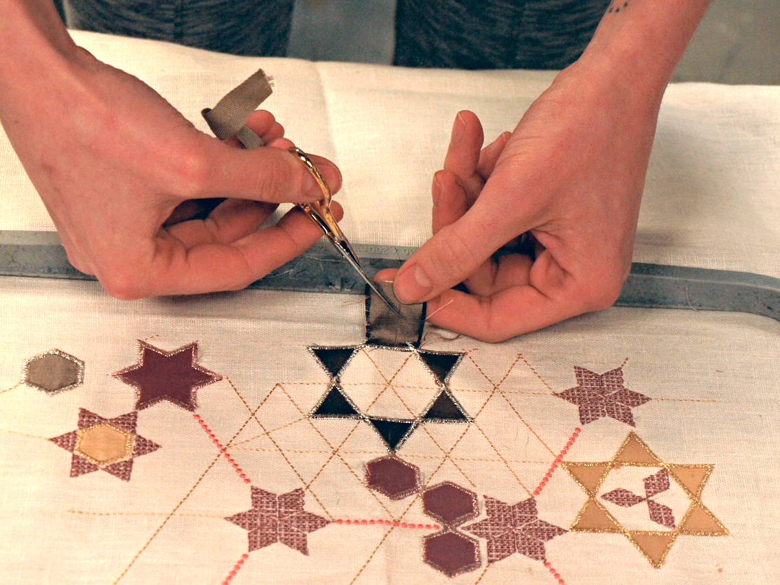 The linen fabric is hooped, thread is fed through the machine and the embroidery process begins. The meticulous hand work of silk appliqué with metallic thread is time consuming and requires precision. The machine mesmerizes as the initial hand drawn artwork materializes into stitches.